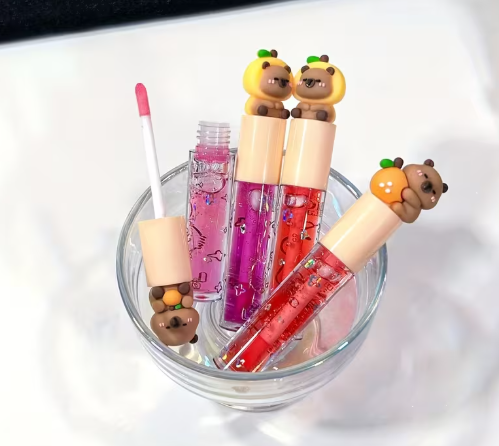 Topper de Mascota Adorable: La tapa de cada brillo está coronada por una figura de resina de un Capibara (o un pequeño osito, dependiendo de tu mercado), algunos incluso llevan un gorrito de fruta (naranja o limón). ¡Son un accesorio de moda en sí mismos!